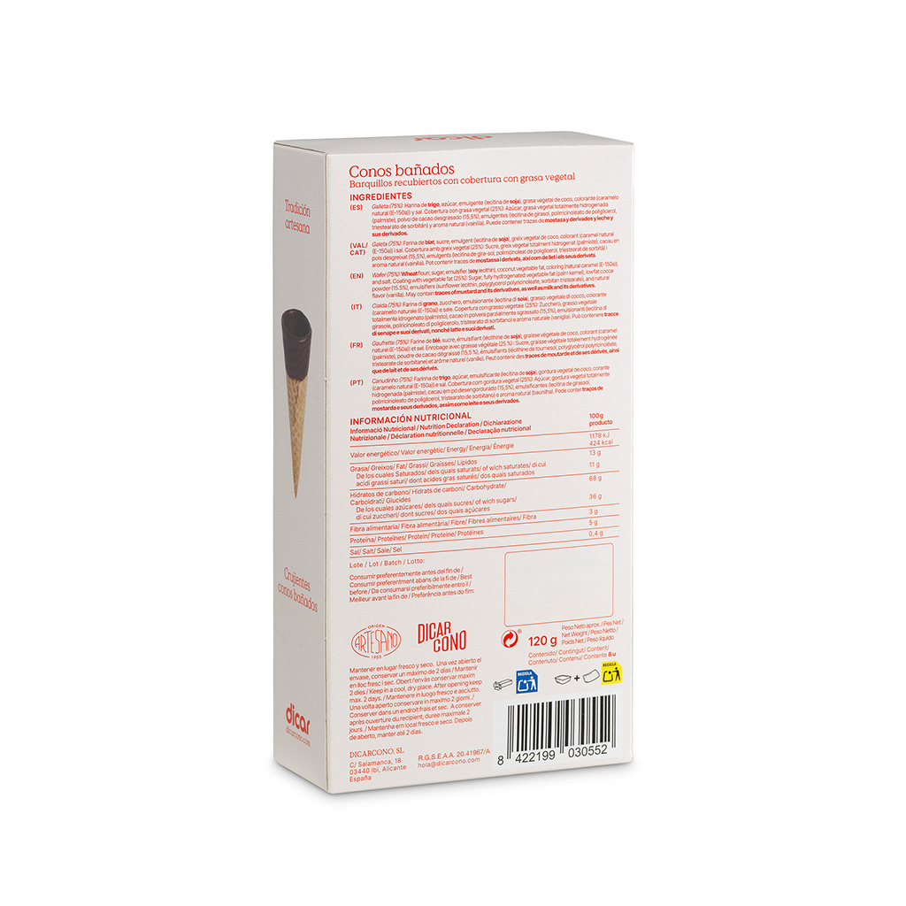 El auténtico Cucurucho Artesano de heladería bañado en chocolate para disfrutar dónde y cuando quieras. Este formato que encontrarás en supermercados contiene 8 cucuruchos del mejor barquillo que puedas probar. ¡Los barquillos Dicar! Caducidad: 12 meses.
